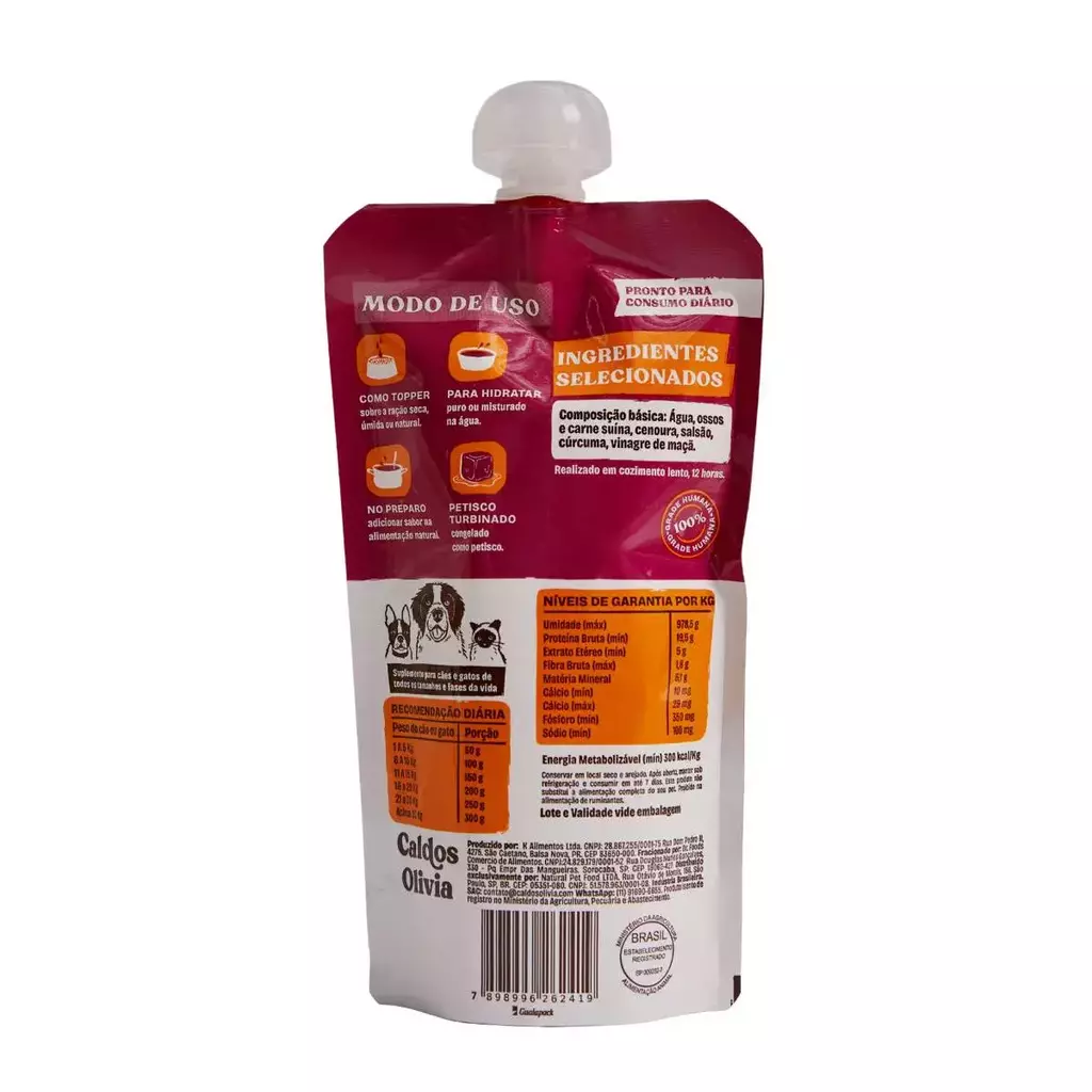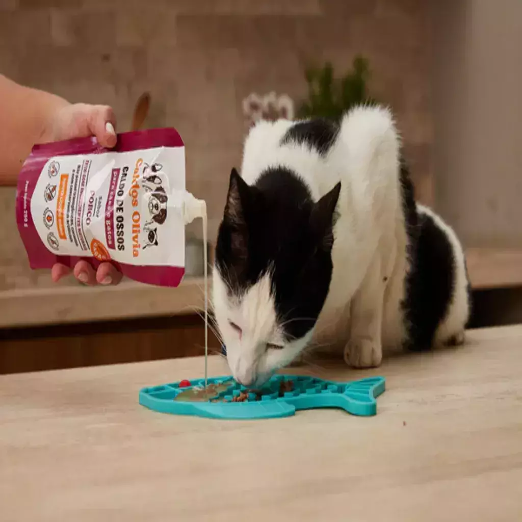Caldo de Ossos Olivia – Sabor Porco é feito a partir de ossos e carnes cozidos lentamente, liberando colágenoaminoácidos e minerais essenciais. Pode ser servido puro, misturado à ração ou usado para reidratar alimentos desidratados — tornando qualquer refeição mais nutritiva e irresistível.Nutrição funcional para cães e gatos