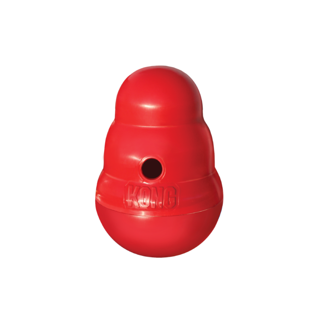 O KONG Wobbler™ é um brinquedo interativo distribuidor de alimentos que utiliza o sistema de recompensa por comida para manter o cão focado e interessado. Diferente de outros brinquedos, possui movimento de “João Bobo”, sempre voltando à posição vertical, o que desafia o pet a continuar tentando retirar a comida pelo orifício lateral.