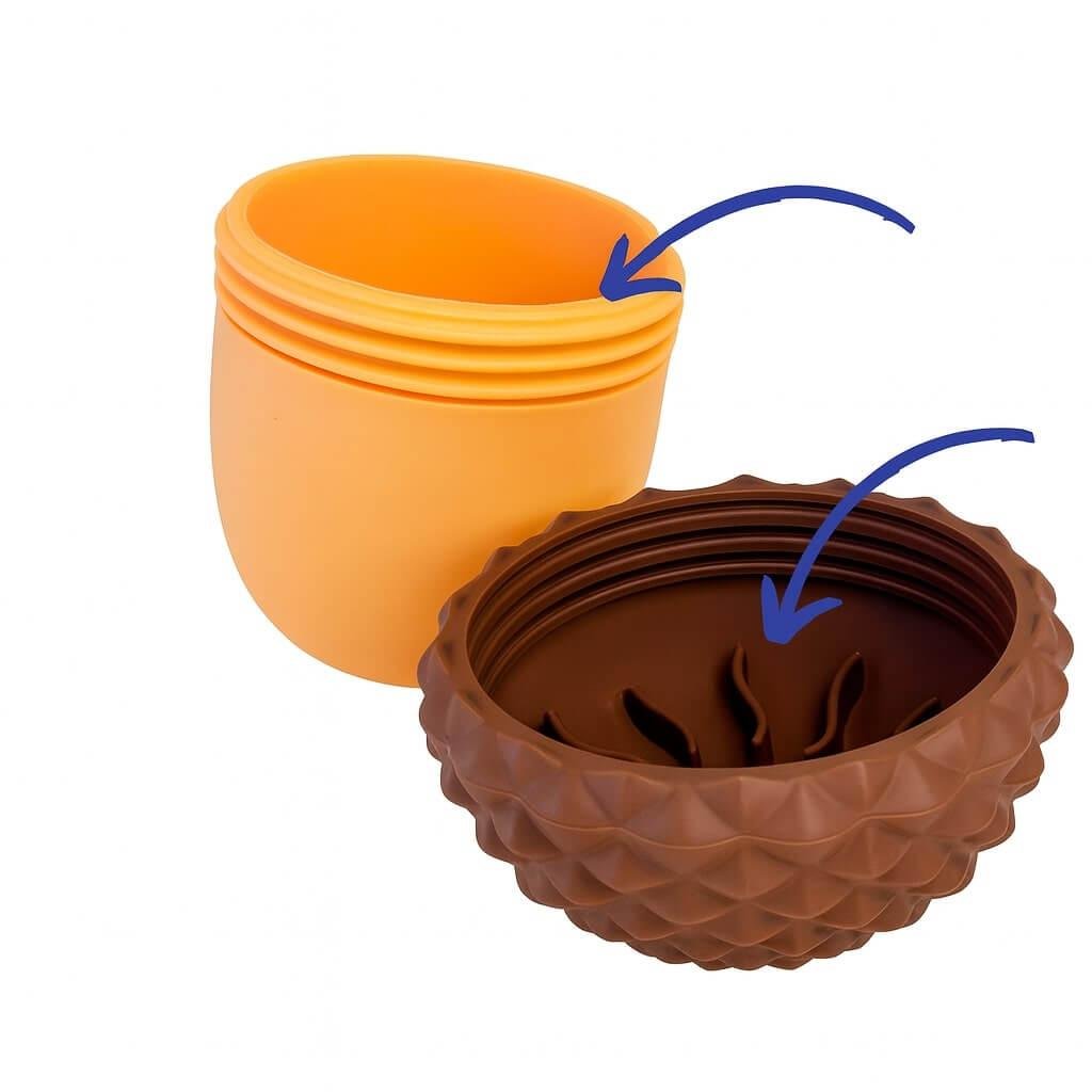 Modo recheável: recheie as duas partes do brinquedo (base e tampa) com alimentação natural ou receitas que o seu pet goste. Você pode também congelar para garantir mais tempo de interação com o brinquedo.